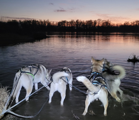 Die längste Tour, die ich mit meinen Hunde bisher gefahren bin, waren 64 Kilometer am Stück mit zwei Pausen zwischendurch. Nach Anzug der Pausen hatten wir eine reine Fahrzeit von 5 Stunden und 11 Minuten.